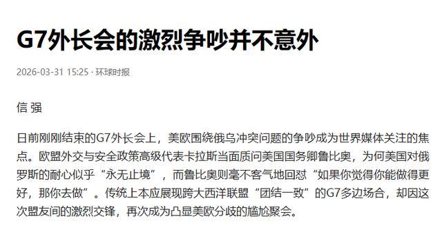在近日召开的七国集团(G7)外长会上,本该彰显跨大西洋同盟团结的各国外长,竟因俄乌议题爆发激烈争吵。欧盟外交与安全政策高级代表卡拉斯怒批美国拒不履行对俄强硬承诺,美国国务卿鲁比奥则当场发飙回怼,直言“你行你上”。