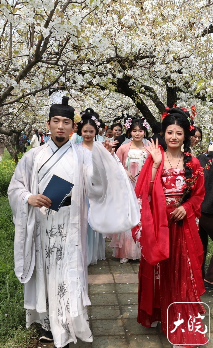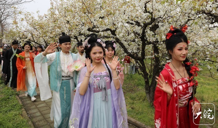 开幕式现场,“梨雪”纷飞间,诗伴舞《贺花神》翩跹上演,十二花神与梨花花神踏歌而来,共贺梨花盛放;寿县第一实验小学学生带来诗歌朗诵《春之韵》,尽显少年眼中的春日芳华。开幕式结束后,花神巡游队伍步步生香,十二花神与梨花花神并肩而行,一路繁花相伴、古韵悠长,将春日风雅展现得淋漓尽致。