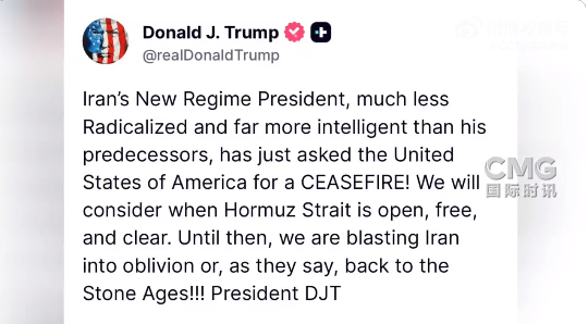 4月1日,特朗普在真实社交发文称,伊朗新政权总统向美国请求停火。