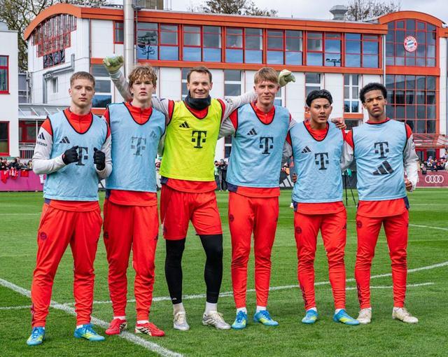 拜仁近期训练场上出现了一幕颇为少见的画面。周二训练结束后,队长诺伊尔与自己所在的对抗赛获胜一方合影留念。站在诺伊尔身边的,是5名来自拜仁青训的年轻球员,而真正熟悉他们的人,恐怕只有最资深的拜仁球迷。据《图片报》介绍,这张合影中共有4名16岁球员和1名18岁球员,5人合计82岁,几乎只是刚在上周五迎来40岁生日的诺伊尔年龄的两倍。更能体现双方年龄差的是,当诺伊尔在2006年8月完成德甲首秀、在2007年9月完成欧冠首秀时,这5名青训球员里还没有任何一人出生,他们都出生于2008年至2010年之间。