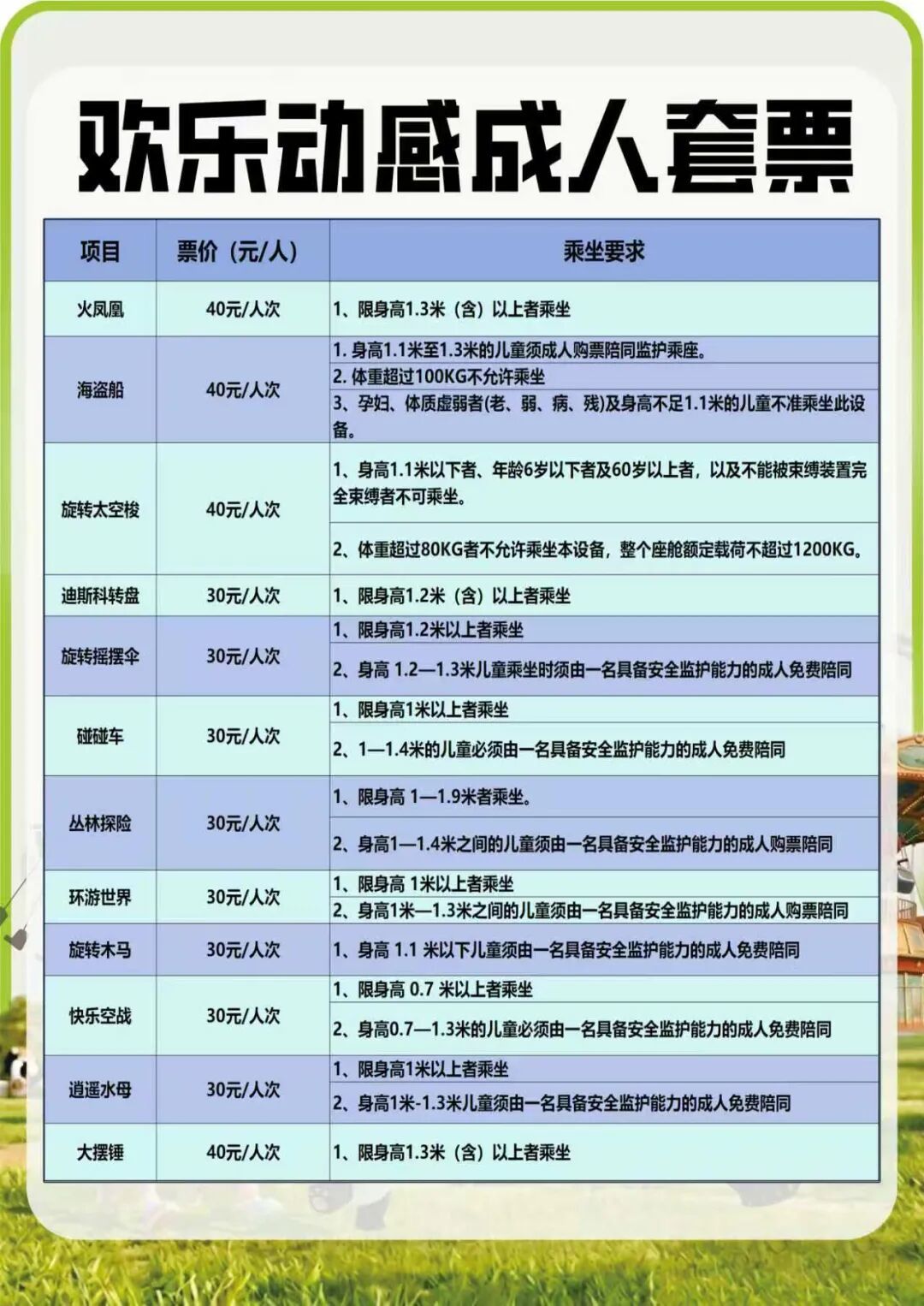 ①欢乐动感票(单人票)158元/人,限身高1.3米以上(含本数)游客使用。太阳之舞体验一次,不限次数按项目要求乘坐范围游乐项目(共计13项);1.4米以下购票游客丛林探险、碰碰车项目需18岁以上监护人购票陪同乘坐。