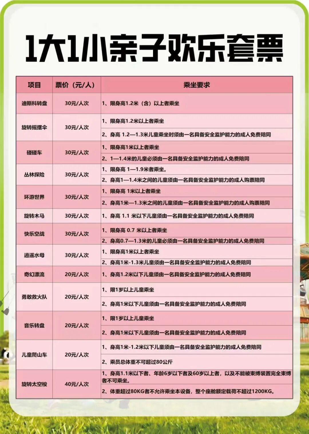 ②亲子欢乐票(亲子票)198元/两人,不限次数乘坐范围游乐项目(共计14项)。限身高1.3 米(不含)以下儿童及监护人(须满18周岁)一同购买。太阳之舞免费体验一次,儿童需根据实际身高乘坐符合身高要求的项目。