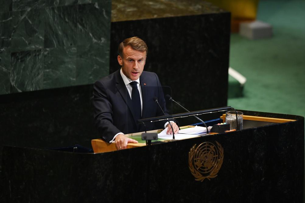 2025年9月22日,在位于纽约的联合国总部,法国总统马克龙在和平解决巴勒斯坦问题和落实“两国方案”高级别国际会议上讲话。新华社记者李睿摄
