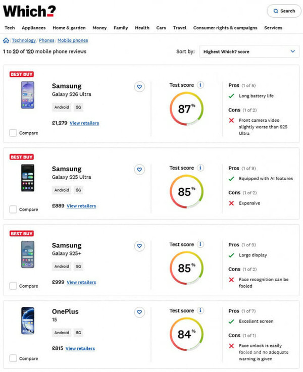 据CNMO了解,具体评测结果为:在英国消费者联盟《Which?》评测中获得87分,位列第一;在法国《Que Choisir》评测中获得17.0分,位列第一;在意大利《Altroconsumo》评测中获得84分,位列第一;在西班牙《OCU》评测中获得84分,位列第一;在葡萄牙《DECO PROteste》、比利时《Test Achats》及瑞典《Rd & Rn》的评测中同样获得最高评价。其中,在意大利、西班牙、葡萄牙和比利时四国的评测中,三星S26 Ultra还获得了代表“最佳测试产品”的“Best of Test”奖项。