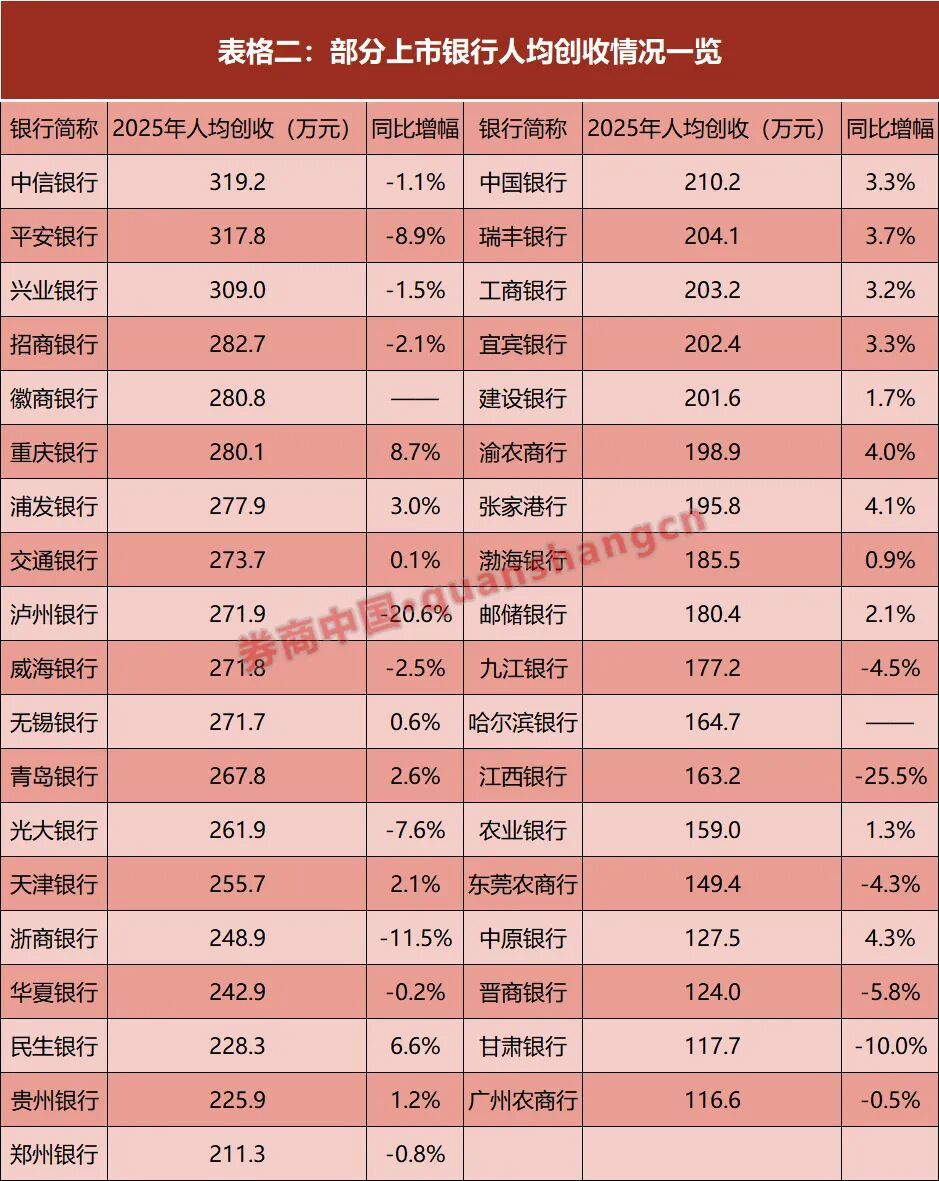 其中,中信银行去年人均创收接近320万元,位列榜首;平安银行、兴业银行紧随其后,人均创收分别约318万元、309万元。