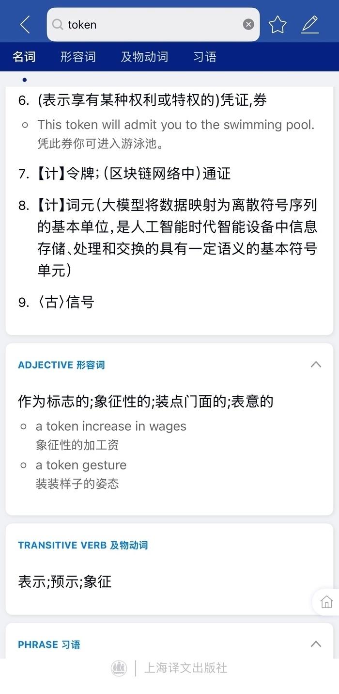 另外,《英汉大词典》APP能够做到及时更新,比如新近为读者所关注的“token”一词,已经更新加入了“词元”这一释义。该释义是全国科学技术名词审定委员会(全国科技名词委)在近期刚刚确认的规范化中文定名。比对纸质版《英汉大词典》(第3版),在2025年,英汉大词典编纂处即收录了这一词汇在AI发展语境下的释义。从纸质版加入新释义,到APP更新其定名,足以显示词典编纂团队和数智化编纂平台在收录标准、知识校准方面的重要作用,让《英汉大词典》真正做到“记录时代的语言”。