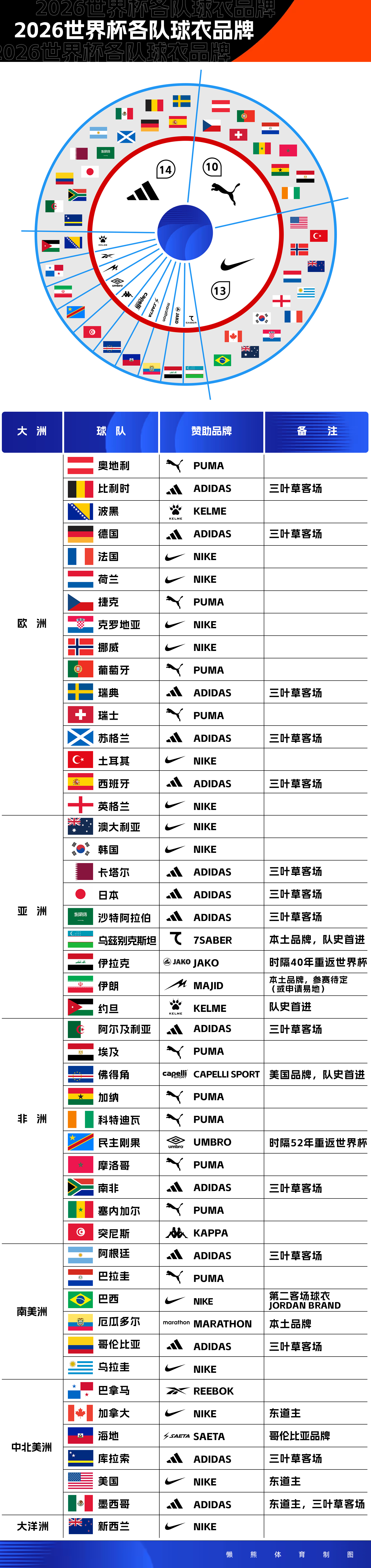 至此,48支球队全部出炉。随之确定的,还有本届世界杯的48个球衣赞助商名单。
