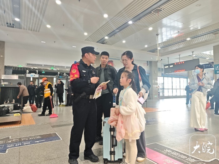 阜阳火车站派出所负责人告诉记者,针对小朋友群体,民警深入车站候车大厅、售票窗口、进出站口等重点区域,通过发放安全宣传手册、现场讲解、趣味问答等形式,向出行的学生及家长普及铁路安全知识,重点讲解严禁攀爬铁路护栏、不随意横穿轨道、乘车时保管好个人物品、防范走失和诈骗等内容。