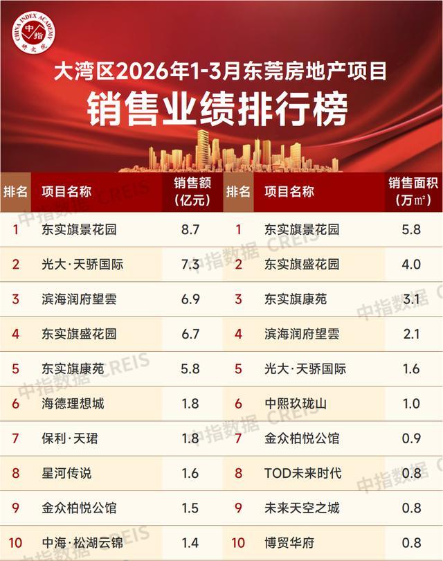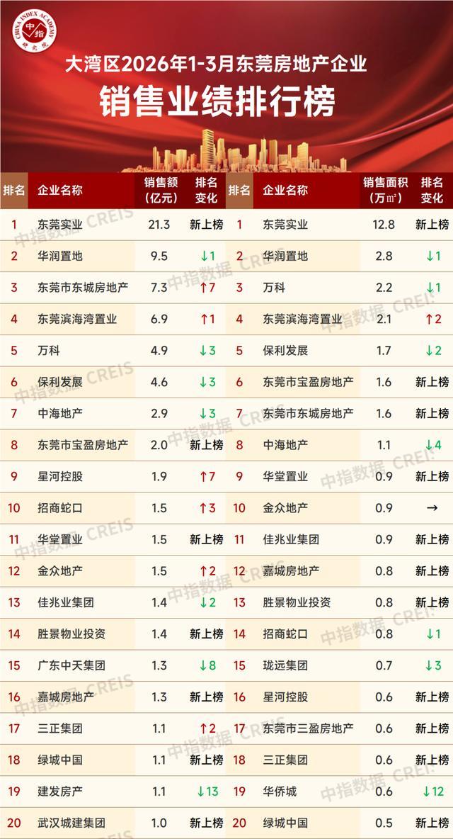 特别声明:房地产企业销售数据统计是以2026年1月1日-3月29期间销售的商品住宅为统计口径,3月30日-3月31日的数据为预估值,包括商品住宅、写字楼、公寓、商业全口径,主要依据中指数据CREIS(点击查看)在东莞市域范围的销售监测数据,并参考当期总体经营情况和推盘去化情况进行分析统计;对于少数没有在监测范围内的企业和项目,由企业提供相关文件,经审核,也纳入统计范围。本报告仅供参考,不对使用报告及其内容所引发的任何直接或间接损失承担责任。