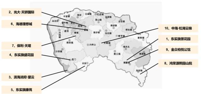 板块分布:TOP10项目销售额榜单中,塘厦镇、东城街道各有2个项目上榜,其余项目分布在滨海湾、凤岗、松山湖、虎门、长安、南城等板块。市场成交仍集中在中心城区与临深片区。