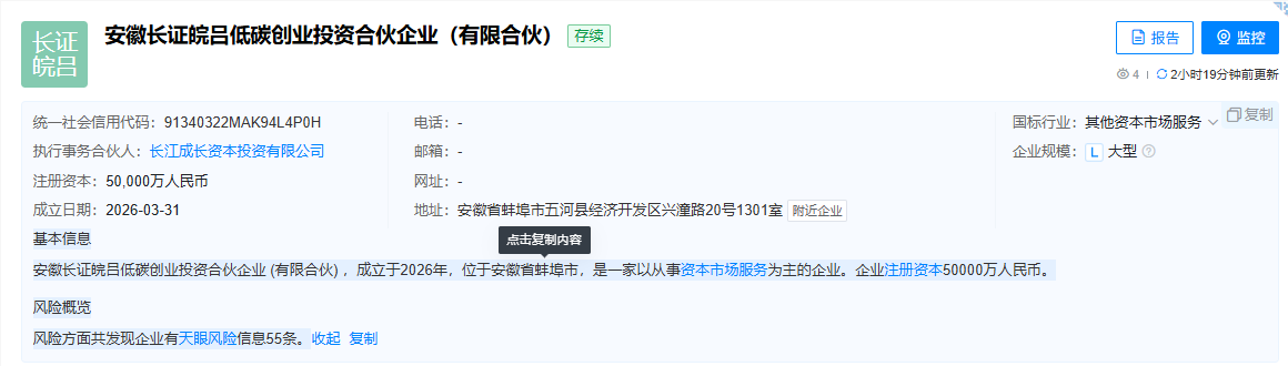 天眼查信息显示,安徽长证皖吕低碳创业投资合伙企业 (有限合伙) ,成立于2026年,位于安徽省蚌埠市,是一家以从事资本市场服务为主的企业,经营范围包含创业投资(限投资未上市企业)、以自有资金从事投资活动。企业注册资本50000万人民币,执行事务合伙人为长江成长资本投资有限公司。长江成长资本投资有限公司由长江证券股份有限公司全资控股。