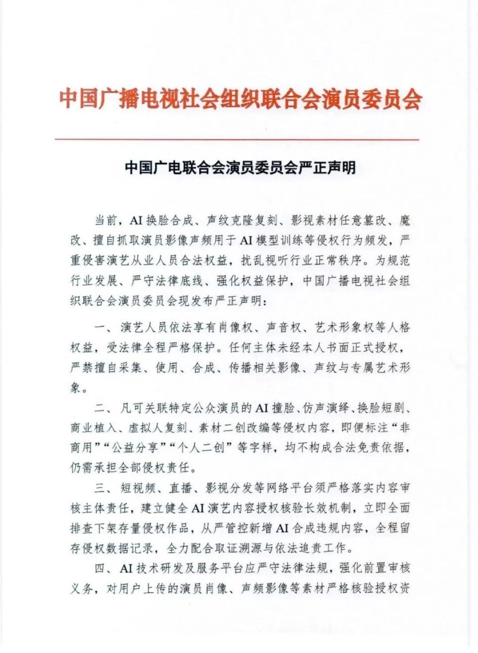 当前,AI换脸合成、声纹克隆复刻、影视素材任意篡改、魔改、擅自抓取演员影像声频用于AI模型训练等侵权行为频发,严重侵害演艺从业人员合法权益,扰乱视听行业正常秩序。为规范行业发展、严守法律底线、强化权益保护,中国广播电视社会组织联合会演员委员会现发布严正声明: