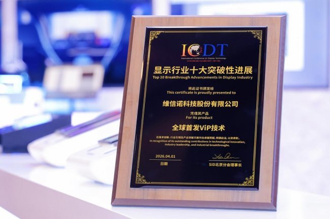 4月1日,ICDT2026开幕式揭晓“中国显示行业十大突破性进展”,维信诺全球首发ViP技术成功入选。该评选由国际信息显示学会SID北京分会发起,面向2016年至2026年间中国显示行业在技术研发、产业化及应用拓展领域形成显著影响的代表性成果,并经50余位SID北京分会技术委员会专家评审。
