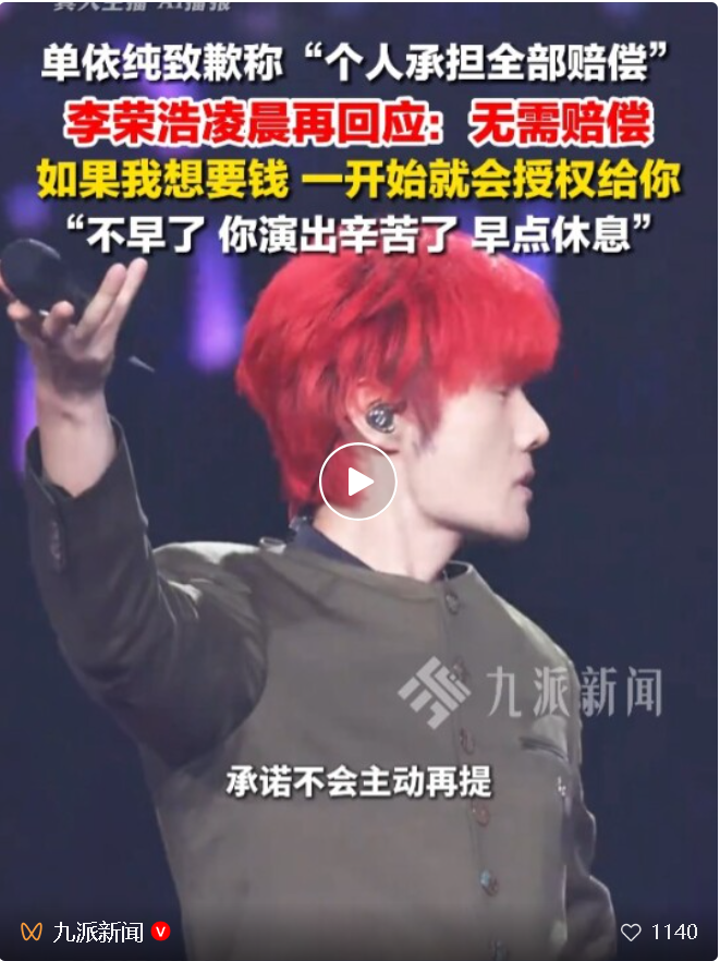 此前,3月29日,歌手单依纯因28日在“纯妹妹2.0”深圳演唱会上未经授权翻唱李荣浩的作品《李白》,陷入版权侵权风波,引发李荣浩公开质问及行业对版权问题的热议。