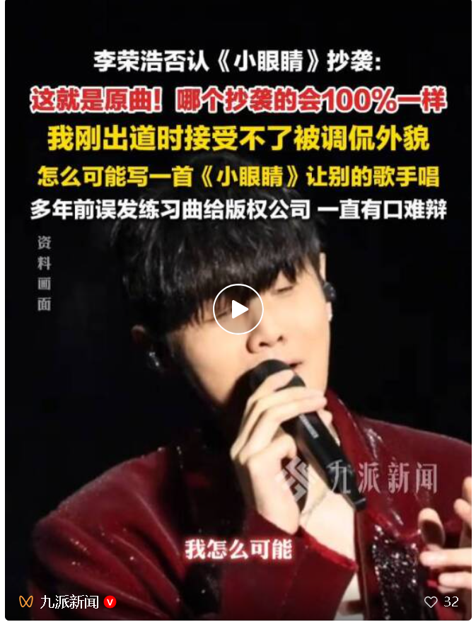 4月1日,歌手李荣浩在其个人社媒发布长文回应歌曲《小眼睛》涉嫌抄袭平井坚《Signal》一事,李荣浩明确表示没有抄袭。