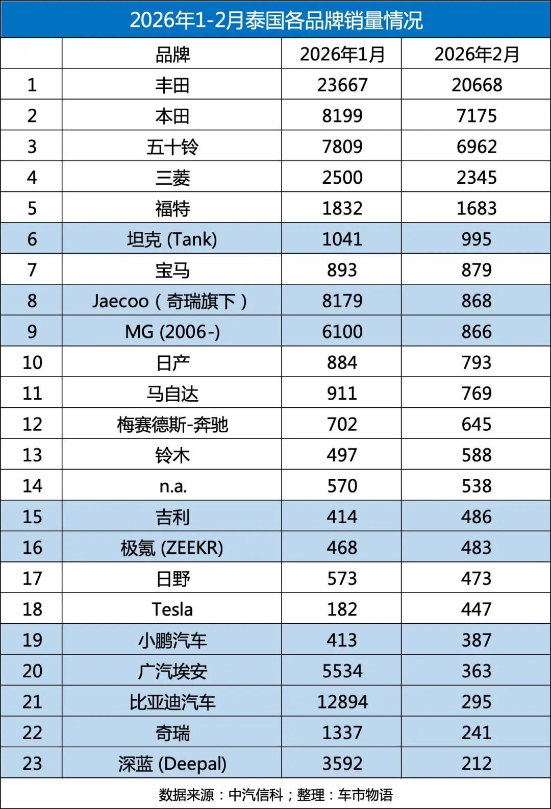 2026年2月泰国各汽车品牌销量图(来源:car250)