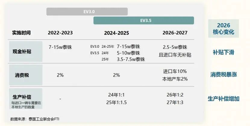 更严厉的是 “产能对赌”:政府要求车企必须用“本地生产”换取“进口资格”。2026年,每进口1辆必须在泰生产2辆;2027年则变为1:3。