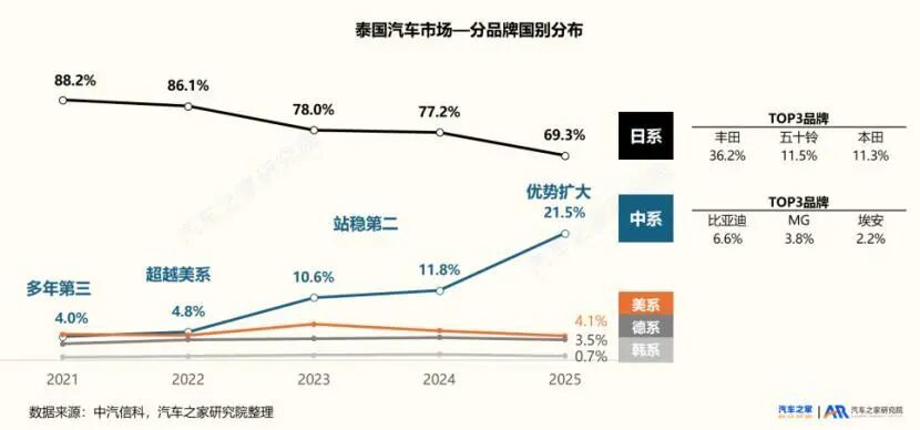今年1月,泰国车市爆出头条:中国品牌以47.34%对47.338%的微弱优势,历史上首次超越盘踞60多年的日系车!比亚迪稳坐第二,前十名中国占六席。很多人欢呼:日系“铁王座”要易主了?