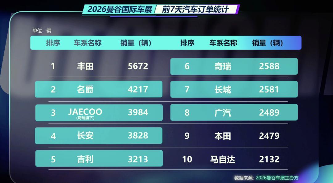 就在这片“燃油焦虑”下,一墙之隔的曼谷国际车展成了中国品牌的“高光舞台”。前四天的订单显示,前十名中中国品牌横扫七席(比亚迪将在车展最后一天公布订单)。