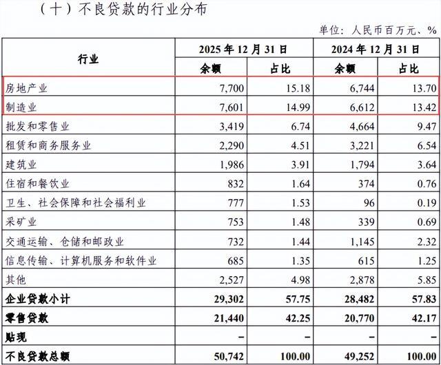 对公贷款的资产质量被两个行业“拖累”:房地产业与制造业。其中,房地产业贷款不良率攀升至15.18%,不仅稳居首位,还较上一年再升1.48个百分点;而制造业的风险同样不容小觑,不良率高达14.99%,同比上升1.57个百分点,成为另一个主要的风险点。