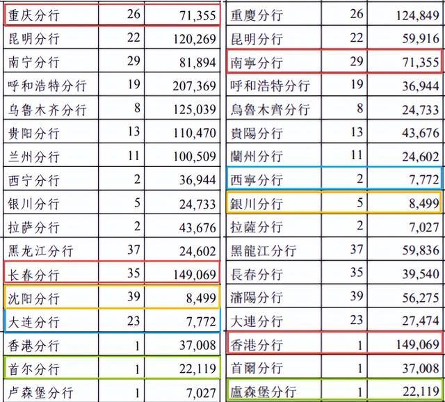 仔细梳理发现,这些分行的规模数据出现了严重的错位情况,比如A股财报中的重庆分行和H股财报中的南京分行的数据是一样的,A股财报中的首尔分行和H股财报中的卢森堡分行的数据、A股财报中的沈阳分行和H股的银川分行的数据是一样的,都是此类问题。