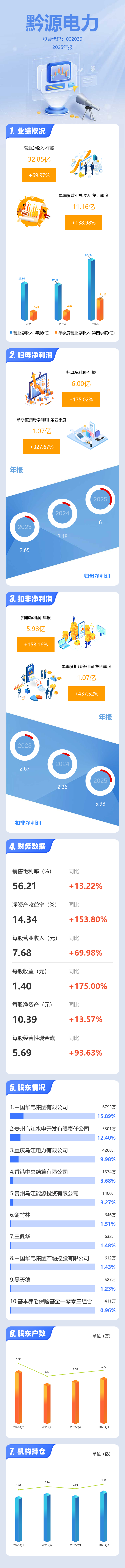 证券之星消息,黔源电力2025年年报显示,当年度公司主营收入32.85亿元,同比上升69.98%;归母净利润6.0亿元,同比上升175.02%;扣非净利润5.98亿元,同比上升153.16%;其中2025年第四季度,公司单季度主营收入11.16亿元,同比上升138.98%;单季度归母净利润1.07亿元,同比上升327.68%;单季度扣非净利润1.07亿元,同比上升437.52%;负债率48.85%,投资收益-275.45万元,财务费用2.15亿元,毛利率56.21%。