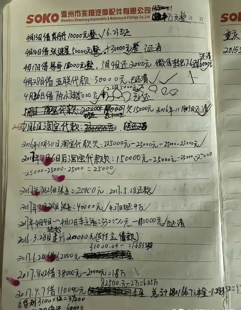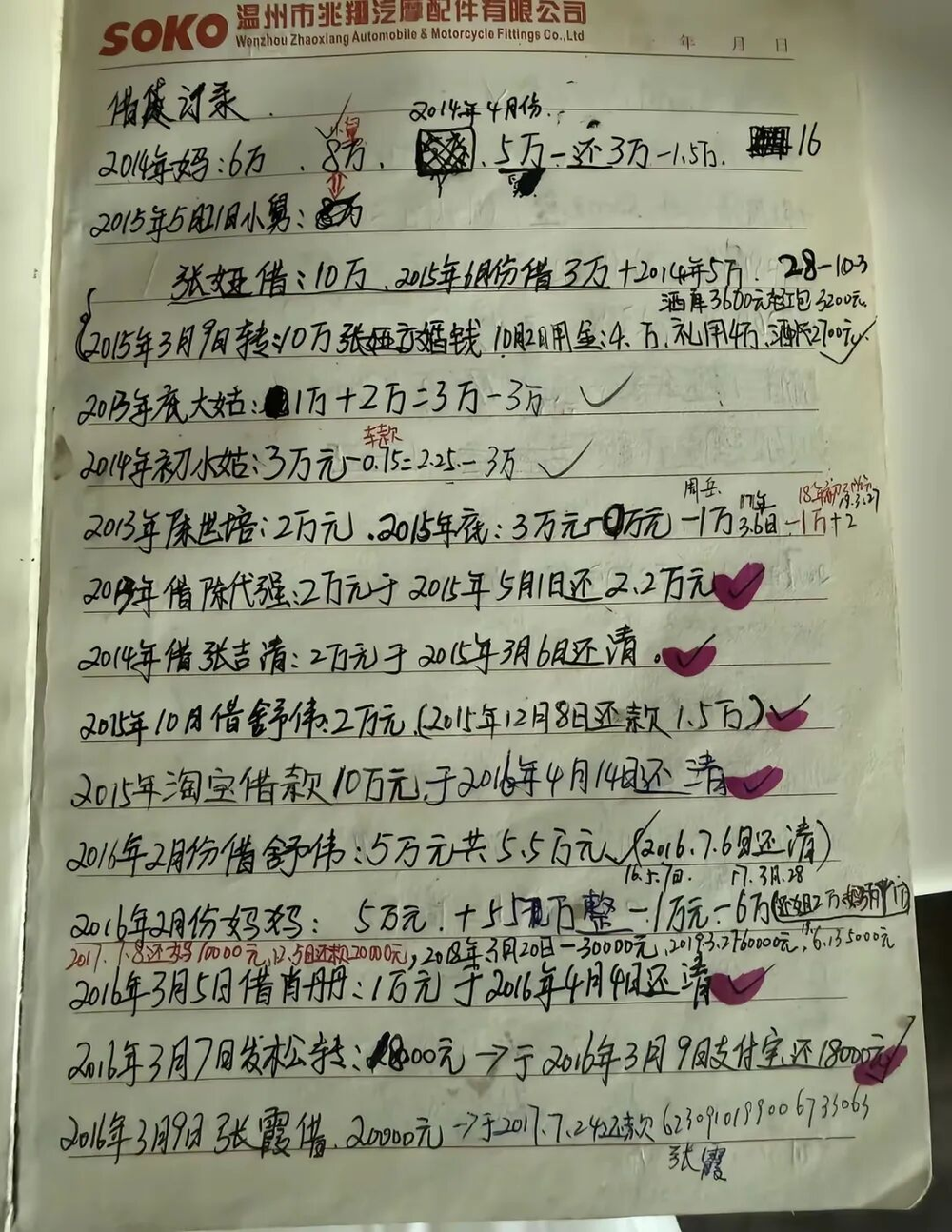 两张账页,字迹潦草,涂改密集,有的数字被彻底涂黑。用纸是温州一家汽配公司的内部信笺。上面记着张雪从2013年起借过的每一笔钱,以及是否还清。