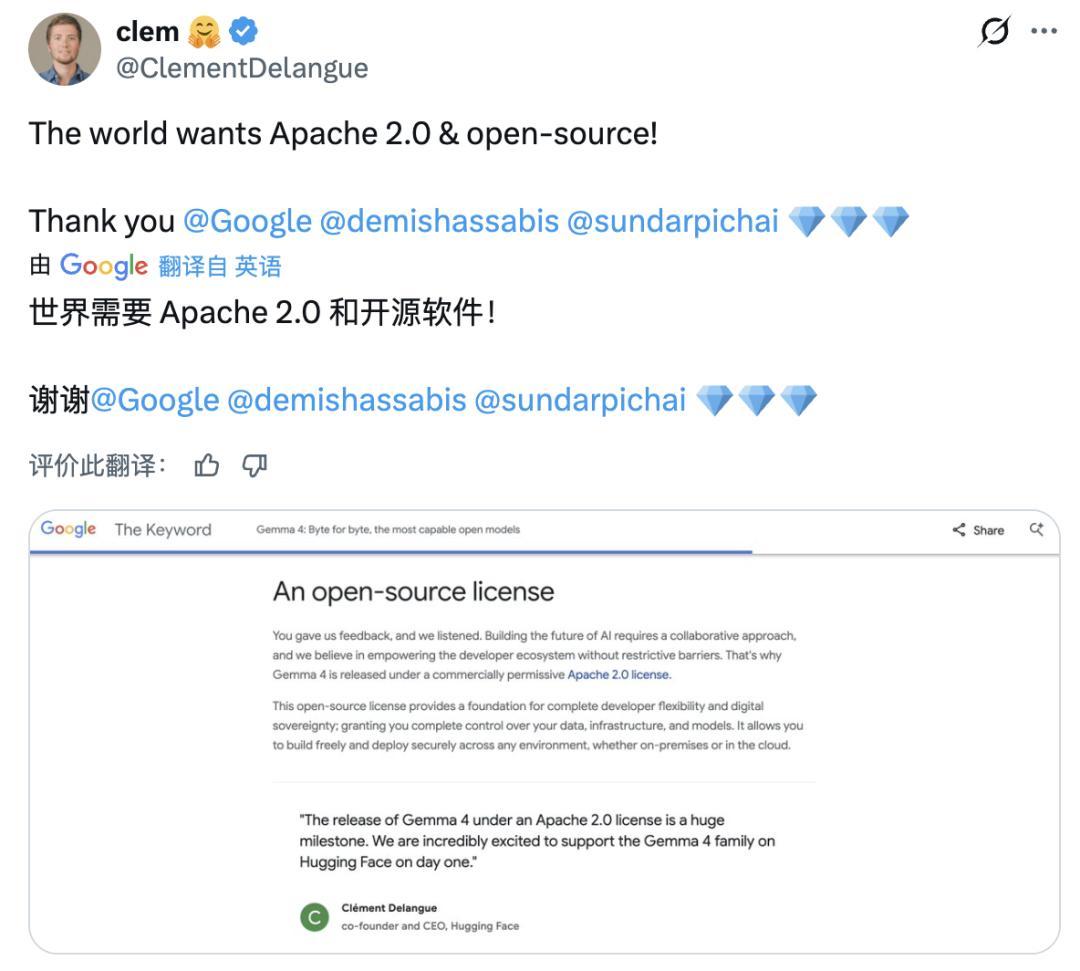Hugging Face 联合创始人兼 CEO Clément Delangue 将此次授权切换称为「一个重要的里程碑」。自 2024 年 2 月首代发布至今,Gemma 系列总下载量已超 4 亿次,社区衍生变体超过 10 万个。