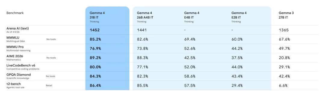 基准测试的数字,能更直观地说明这一代的升级幅度。与上一代 Gemma 3 27B 相比,Gemma 4 31B 在数学推理基准 AIME 2026 上从 20.8% 跳升至 89.2%,代码能力基准 LiveCodeBench v6 从 29.1% 升至 80.0%,衡量 Agent 工具调用能力的 τ2-bench 则从 6.6% 大幅提升至 86.4%。