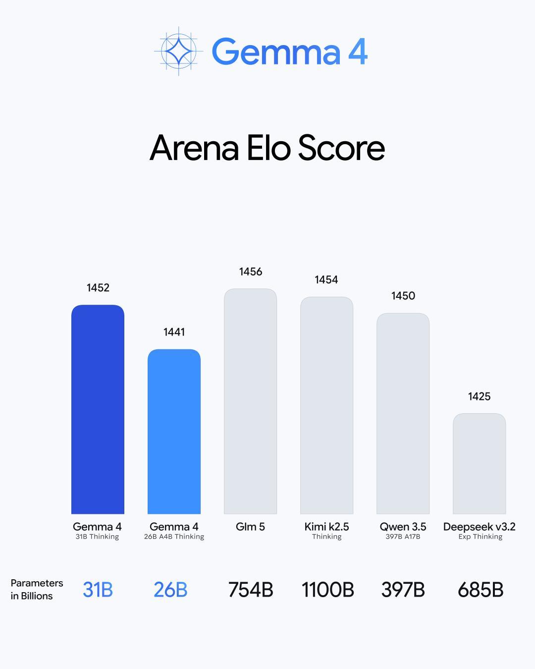 26B MoE 的 Arena AI 评分接近参数量约 15 倍的 Qwen3.5-397B-A17B,31B Dense 的评分则与体量在 600B 以上的 GLM-5 处于同一梯队。Google 将其概括为「单位参数智能密度前所未有」,至少数字显得有理有据。