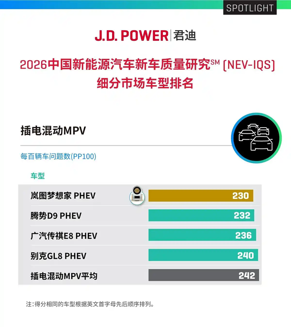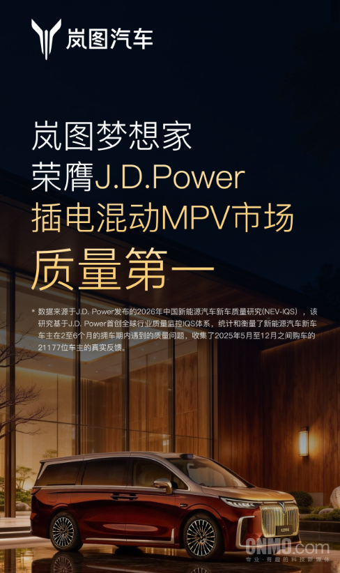 【CNMO科技消息】据CNMO了解,J.D. Power发布的2026中国新能源汽车新车质量研究结果显示,岚图梦想家斩获插电混动MPV质量第一。这项研究基于行业通用的IQS体系,并针对新能源车特有问题进行了补充,统计了新车主在2至6个月拥车期内遇到的质量问题,以平均每百辆车问题数(PP100)作为评价标准,数值越低代表质量越好。岚图梦想家此次的PP100值为230个,远低于插电混动MPV细分市场242个的平均值。