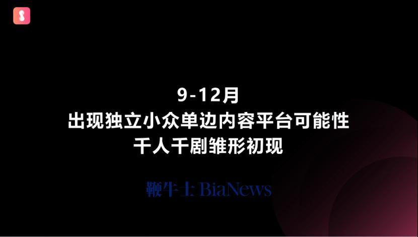 其实现在有些头部公司已经可以做到一个月生产几百部,甚至上千部了。今年9-10月份,我觉得会有很多公司,甚至不需要体量很大的公司都能做到。这个时候你就可以根据你的细分领域做个独立的单边平台,那个时候就是爱、优、腾、芒打得最激烈的时候。