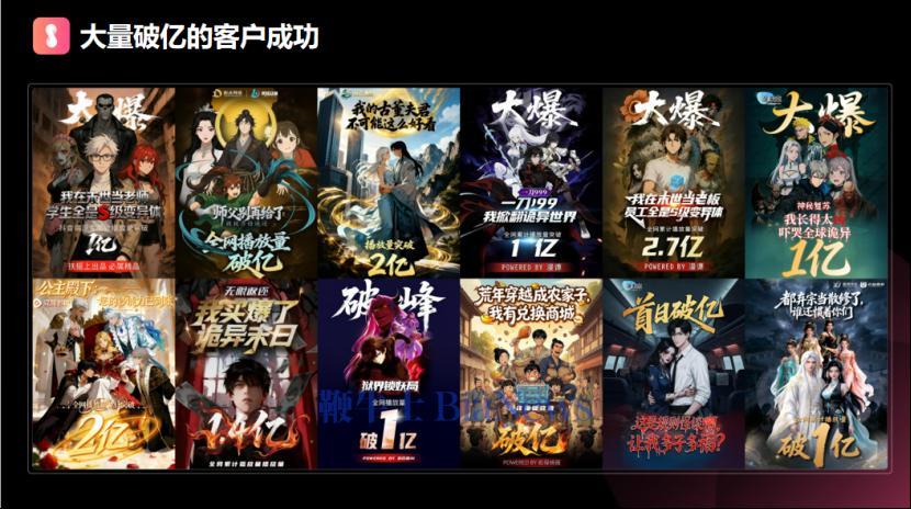 因此,我们过去帮助许多客户拿到成绩,这一面墙里每一张海报播放量都破亿。其实在过去的时间里,漫剧破亿的数量还是有限的,应该是50多部,我们在其中占据很高比例。