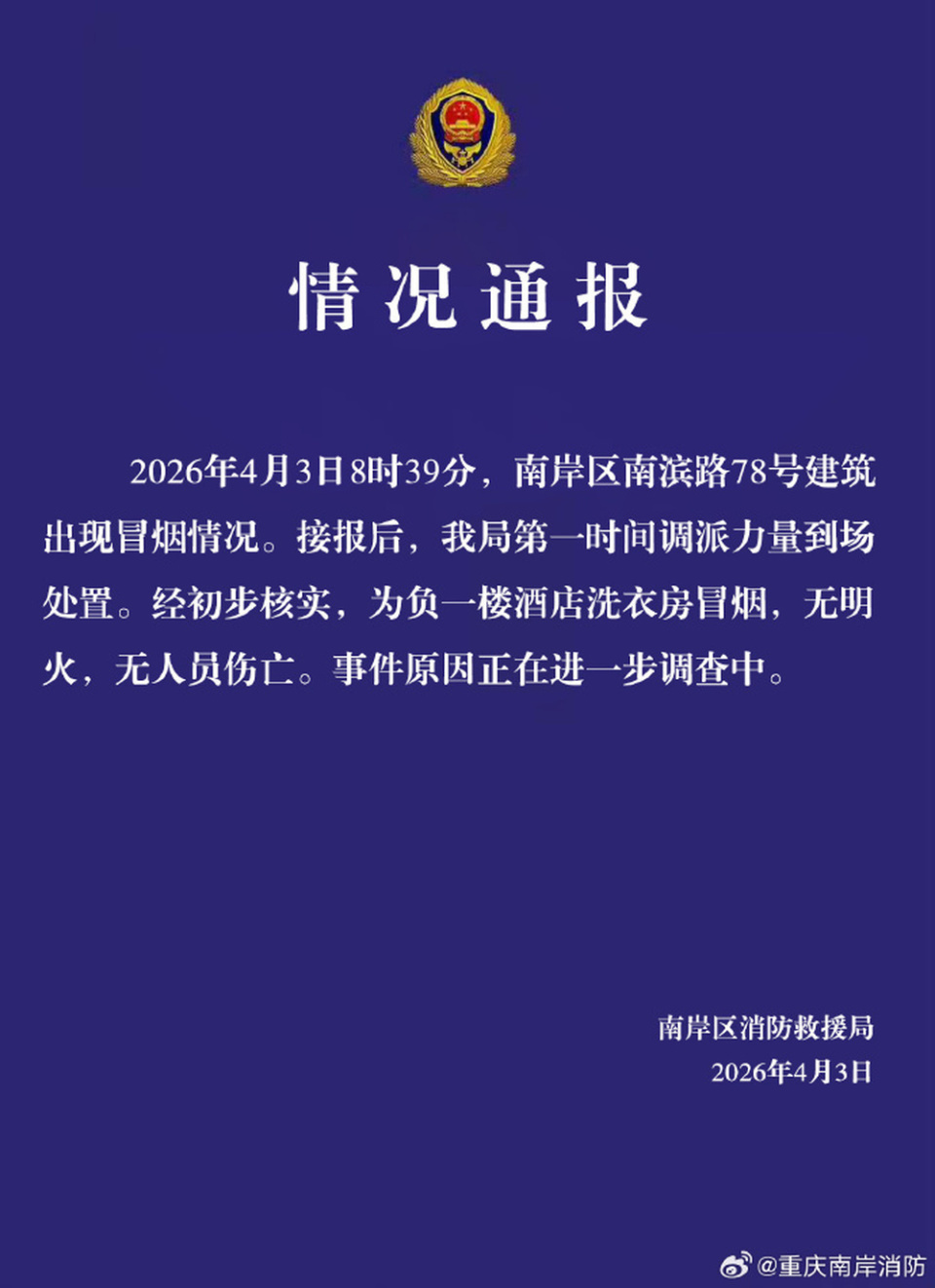 2026年4月3日8时39分,南岸区南滨路78号建筑出现冒烟情况。接报后,我局第一时间调派力量到场处置。经初步核实,为负一楼酒店洗衣房冒烟,无明火,无人员伤亡。事件原因正在进一步调查中。