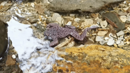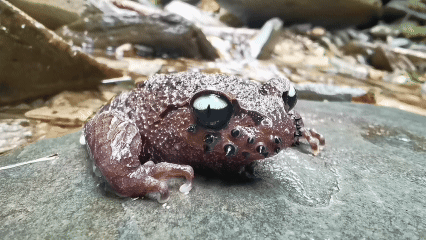 因其雄性上唇缘有排列不规则的黑色角质刺,哀牢髭蟾被称为“胡子蛙”,是锄足蟾科髭蟾属的两栖动物,主要分布于云南哀牢山与无量山海拔2200米至2600米、生态环境保存完好的常绿阔叶林林下及山溪中。