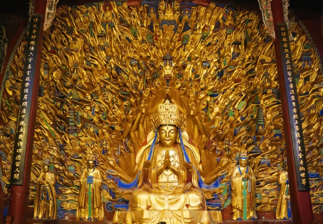 宝顶山大佛湾千手观音造像是宝顶山石刻的精华与代表作。匠人们在面积88平方米的岩面上,以主尊观音造像为中心,呈辐射状雕凿出千只手,手中多执法器,手心各有一眼,象征智慧与法力无边。整龛造像布局严谨,气势恢宏,是大足石刻千手观音造像发展的巅峰,也是全国同类题材中艺术成就最高的龛窟之一,被誉为“国宝中的国宝”“天下奇观”,在世界石窟艺术史上占有独特地位。