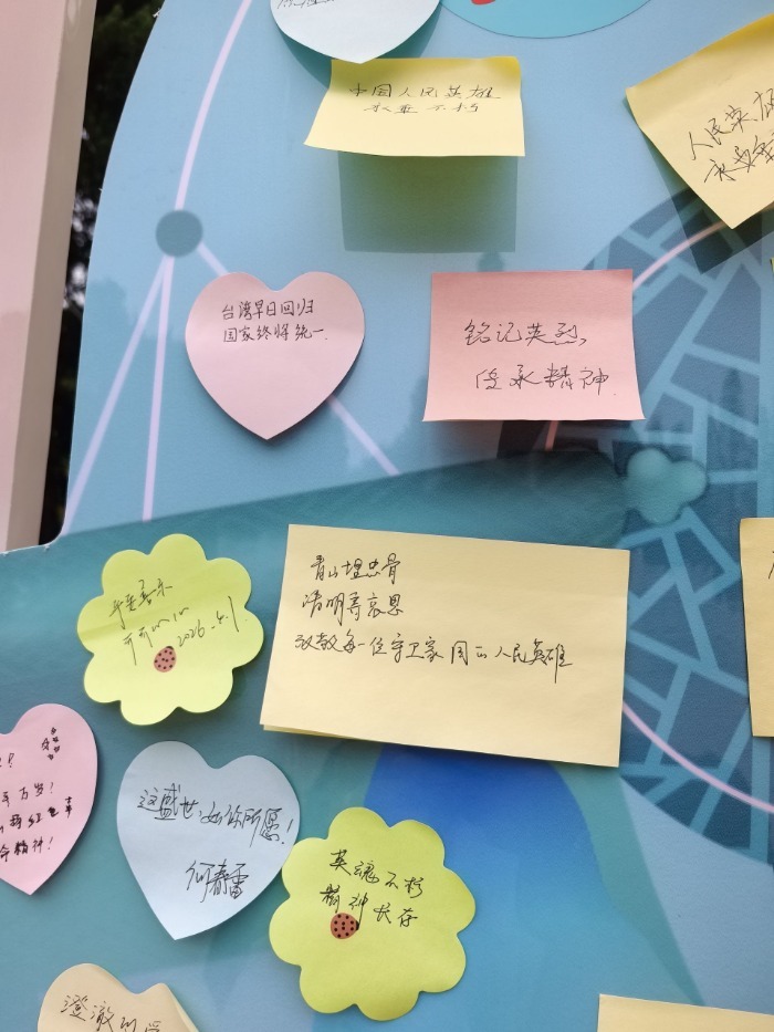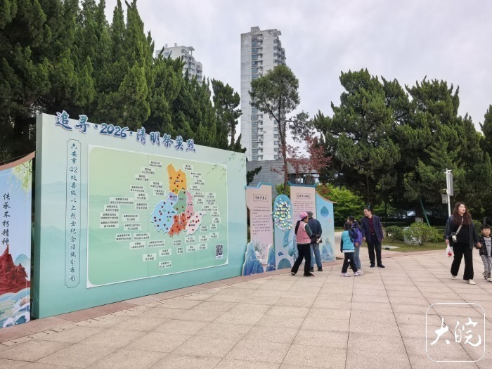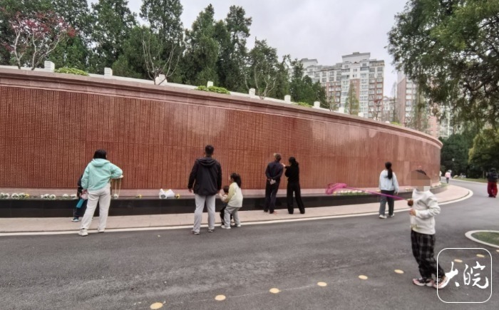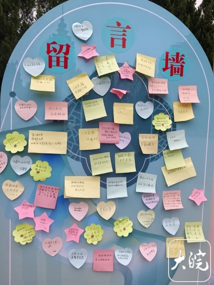 大皖新闻记者看到,有不少家长带着放春假的青少年儿童在展板前驻足,向孩子们讲解一些关于全市各地烈士陵园的知识。记者注意到,在广场一侧设置一处留言墙,上面贴满了写满留言的彩色纸片,“青山埋忠骨 清明寄哀思 致敬每一位守卫家国的人民英雄”“铭记英烈 传承精神”“人民英雄 永垂不朽”“赓续红色血脉 传承革命精神”,每一句留言都表达了人们对革命先烈的无限哀思。