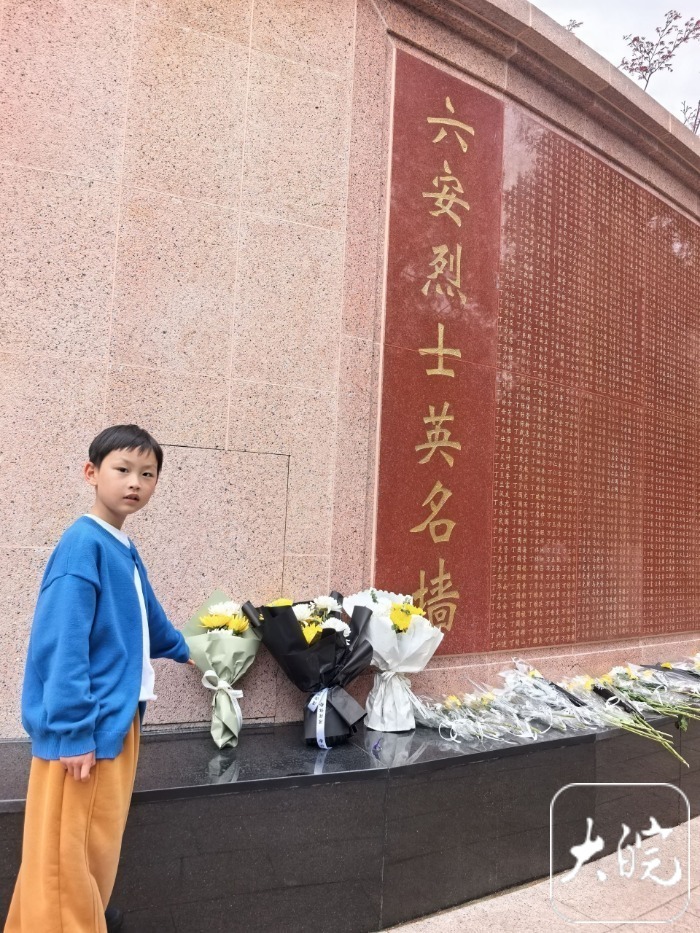 据小朋友的母亲田女士介绍,小朋友来自六安市紫荆小学。他们来到烈士陵园后,郑重地将鲜花敬献在烈士英名墙下。“小朋友,你知道为什么要敬献鲜花吗?”大皖新闻记者问道,“妈妈告诉我,献花是为了纪念革命先烈。”他回答。