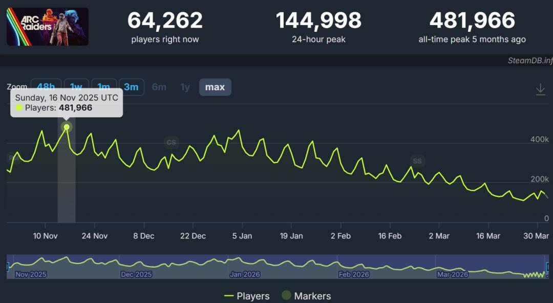 凭借这套侧重PvE体验的搜打撤玩法,《ARC Raiders》在上线初期获得了极为亮眼的表现,游戏Steam同时在线峰值逼近50万。不过,近期笔者观察到,游戏在线活跃已经慢慢往下走,甚至跌落至最高的峰值的1/3。
