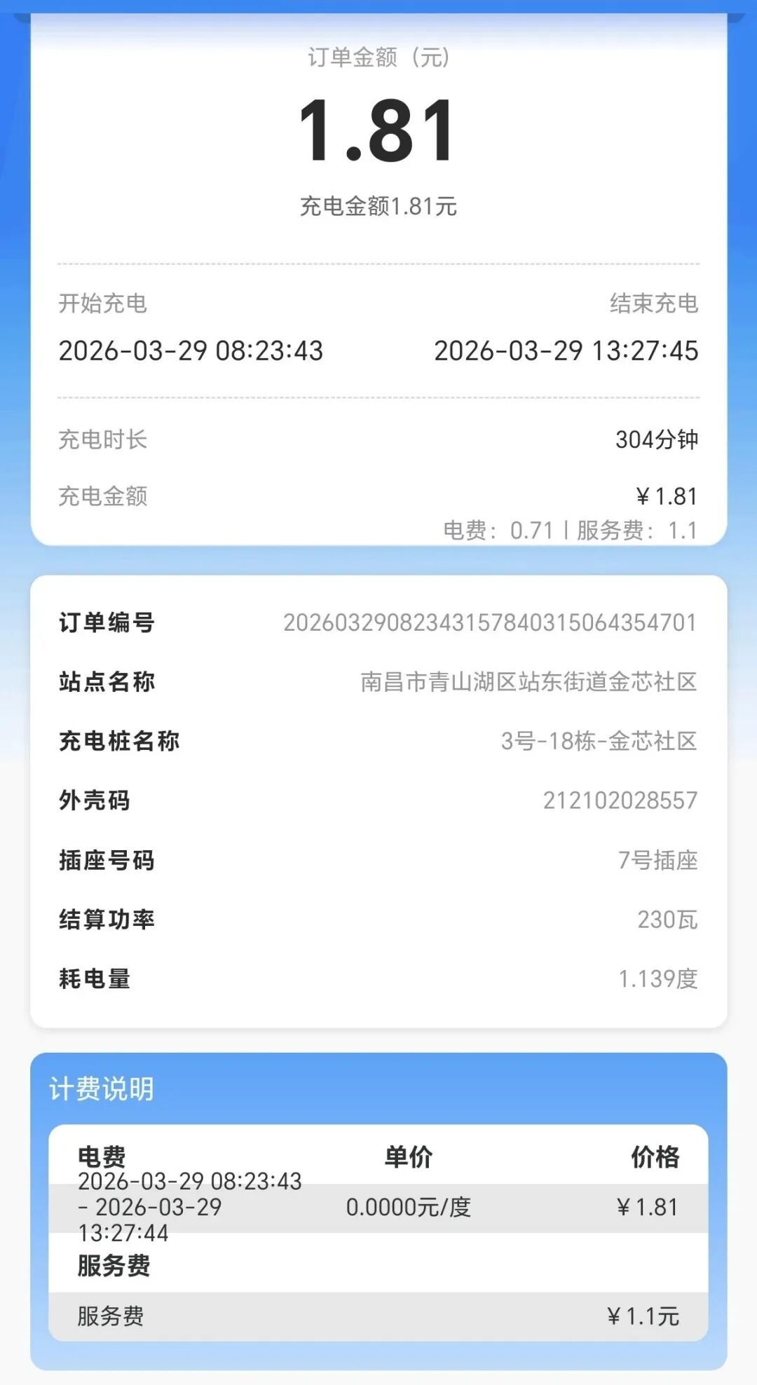 在南昌青山湖区站东街道金芯社区18栋3号充电桩7号插座为电动车充电5小时,共计费用1.81元,其中电费仅0.71元,服务费却高达1.1元,收费标准明显偏高,希望相关部门加强监管,规范收费行为。