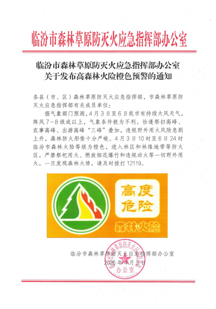 新黄河客户端获悉,4月3日,临汾市森林草原防灭火应急指挥部办公室发布高森林火险橙色预警通知,全文如下:
