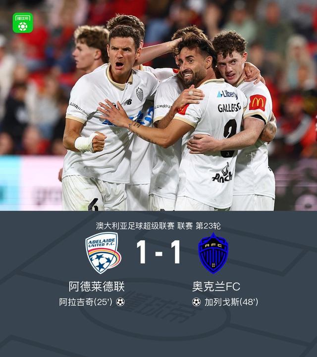 北京时间4月3日澳大利亚足球超级联赛第23轮,阿德莱德联主场对阵奥克兰FC。阿德莱德联阿拉吉奇破门。奥克兰FC加列戈斯扳平。最终比分阿德莱德联1-1奥克兰FC。