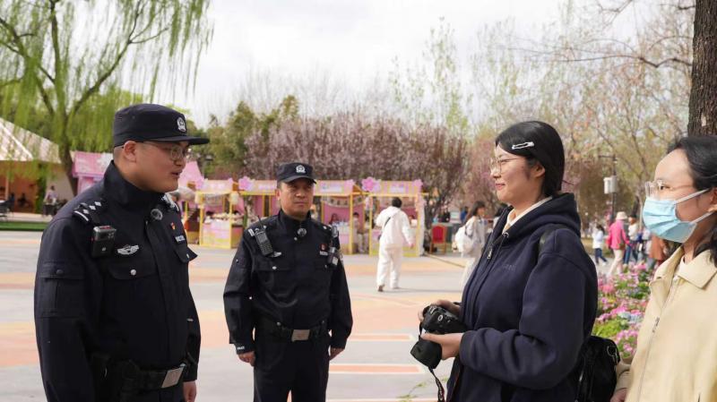朝阳区北小河公园是今年朝阳区踏青、赏花的热门“打卡地”。正在执勤的北京市公安局朝阳分局东湖派出所民警忙着为群众指路,提醒人们注意避开拥堵地点。
