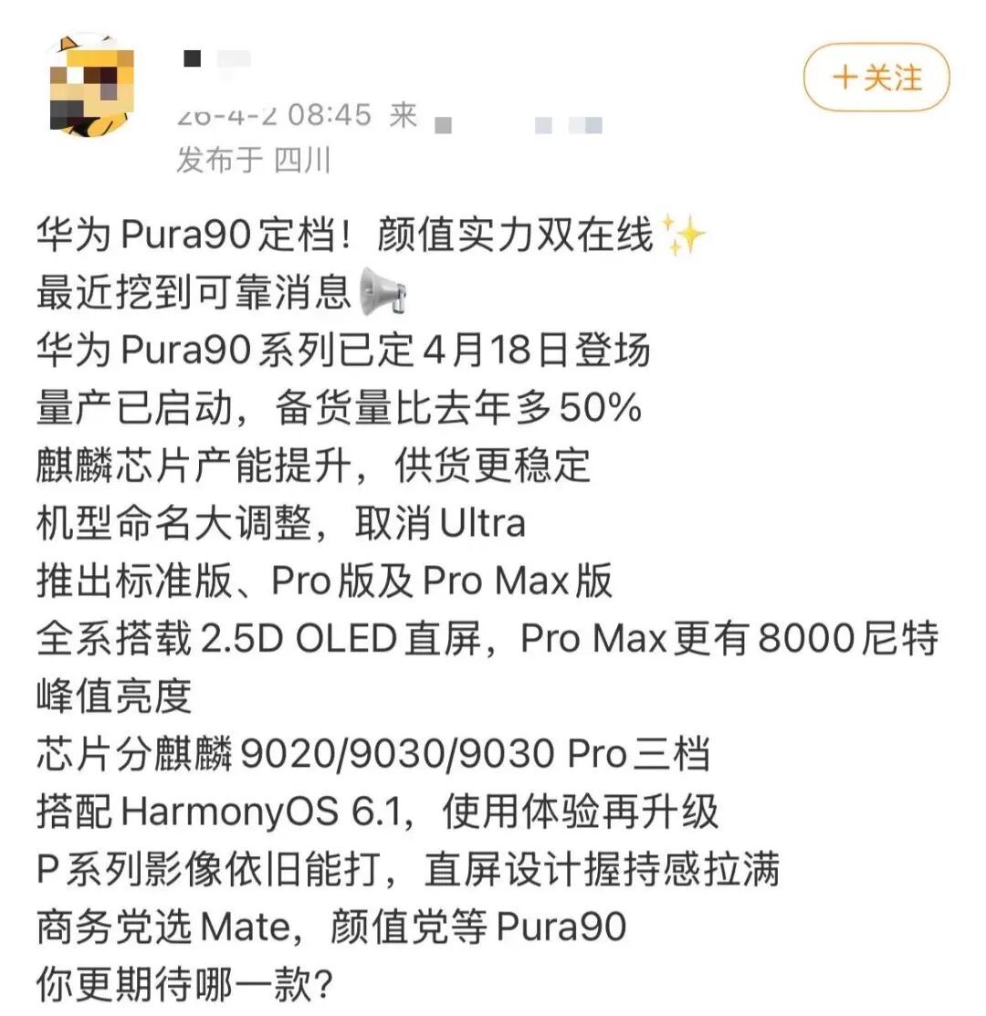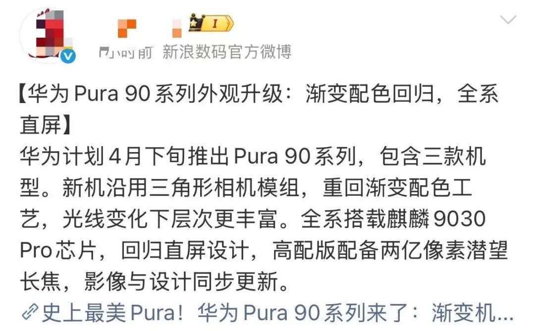 最新爆料,华为将在4月中下旬推出全新年度影像旗舰——Pura 90系列。