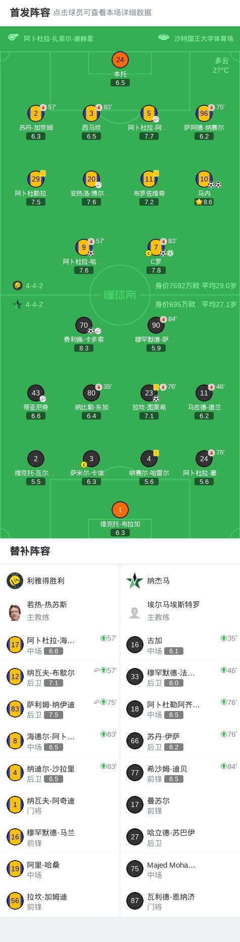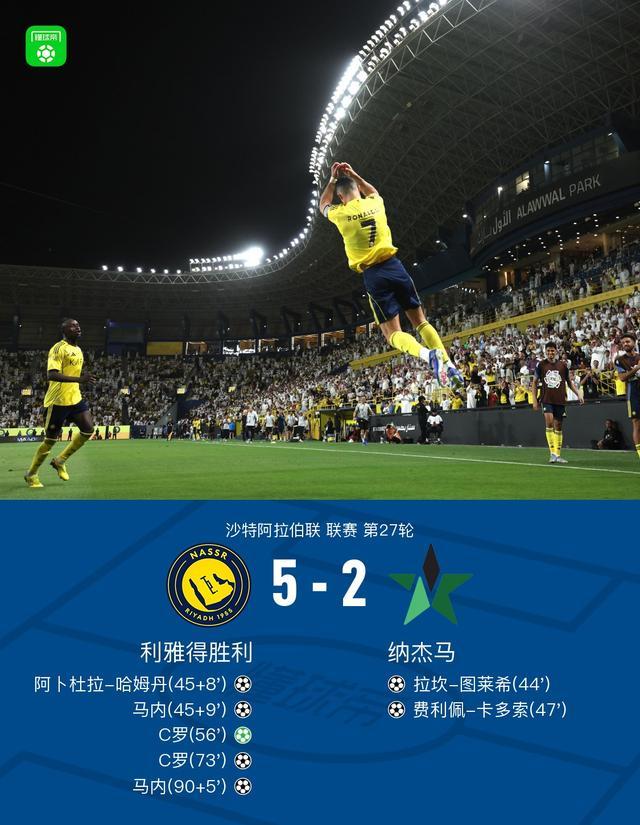 北京时间4月4日沙特阿拉伯联赛 第27轮,利雅得胜利主场对阵纳杰马。上半场尾声图莱希率先破门为纳杰马首开记录,随后哈姆丹、马内在补时阶段先后破门反超比分。下半场卡多索开场破门将比分扳平,但C罗和马内随即相继上演梅开二度,最终利雅得胜利5-2击败纳杰马。