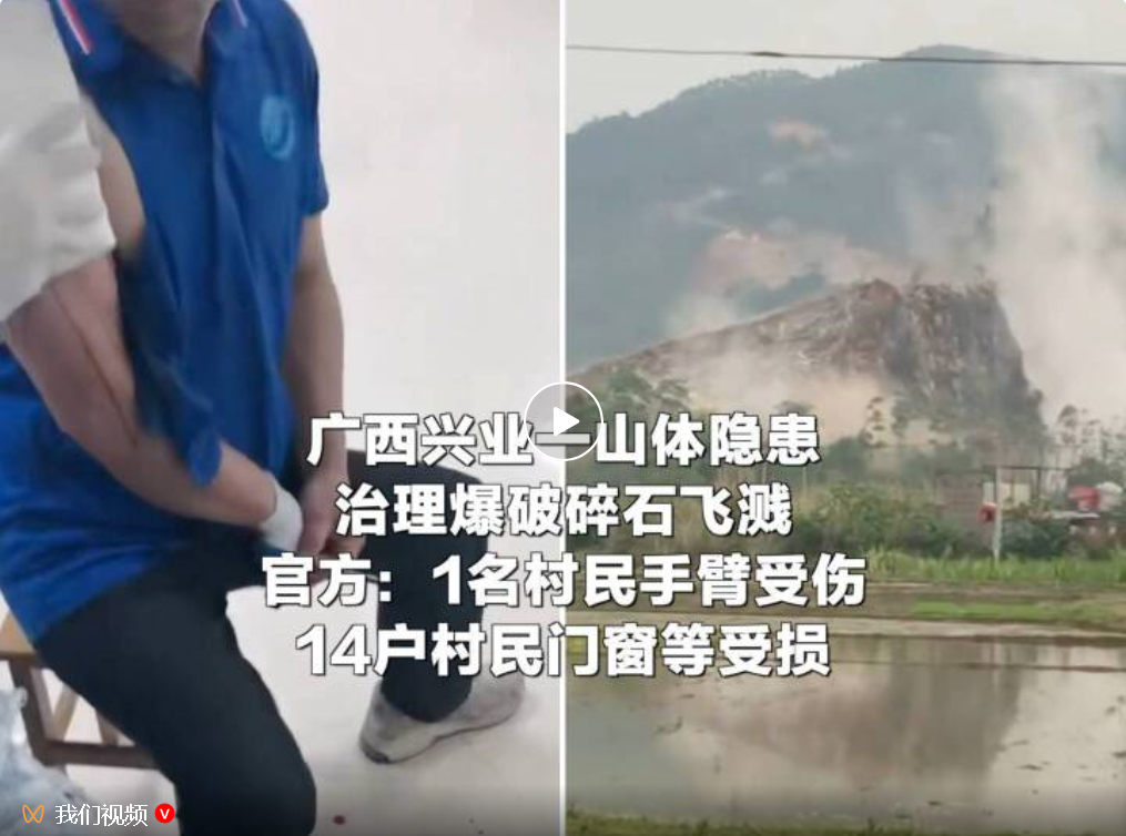 此前据新京报报道:4月2日,广西兴业县新荣村上泉组村民反映,当天附近山体有爆破活动,有爆破碎石飞入村内,监控拍到有村民被飞石砸伤。新荣村村干部庞先生告诉记者,一名村民被石头砸伤,多户民房受损,多部门已到现场处置。记者从兴业县自然资源局获悉,该爆破活动系山体修复工程。