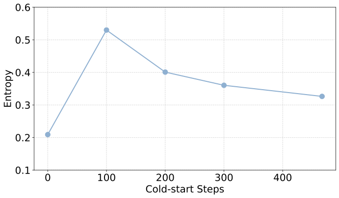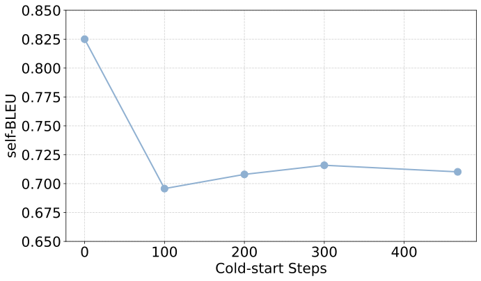 研究团队将目光投向了「输出多样性」,追踪了模型在冷启动训练过程中的熵(Entropy)和 self-BLEU 分数。