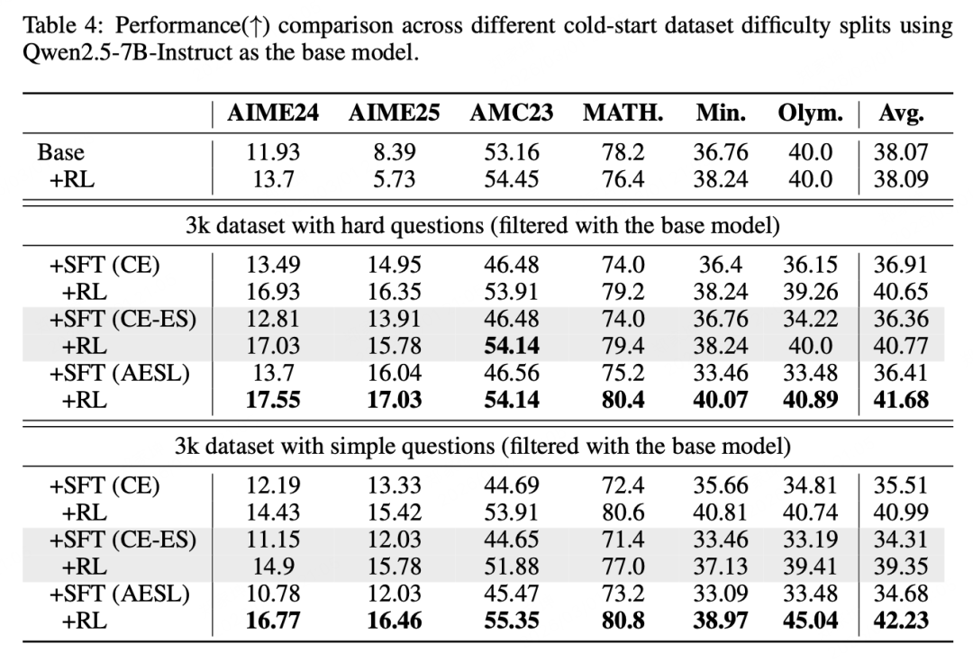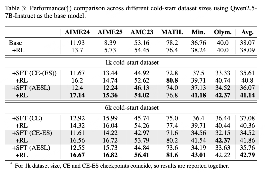 结果令人振奋:无论是在哪种基座模型上,使用 AESL 作为冷启动策略,其后续经过 RL 训练的最终性能,全面碾压了直接 RL、标准 CE 损失 SFT 以及现有的其他前沿方法。AESL 真正做到了「赢在起跑线」。