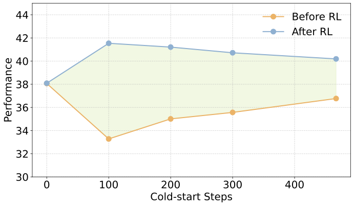 为了解决这个问题,目前的标准做法是:在 RL 之前,先用少量的优质数据进行监督微调(SFT),给模型做一个「冷启动(Cold-start)」热身,以此提高 RL 阶段的效率。