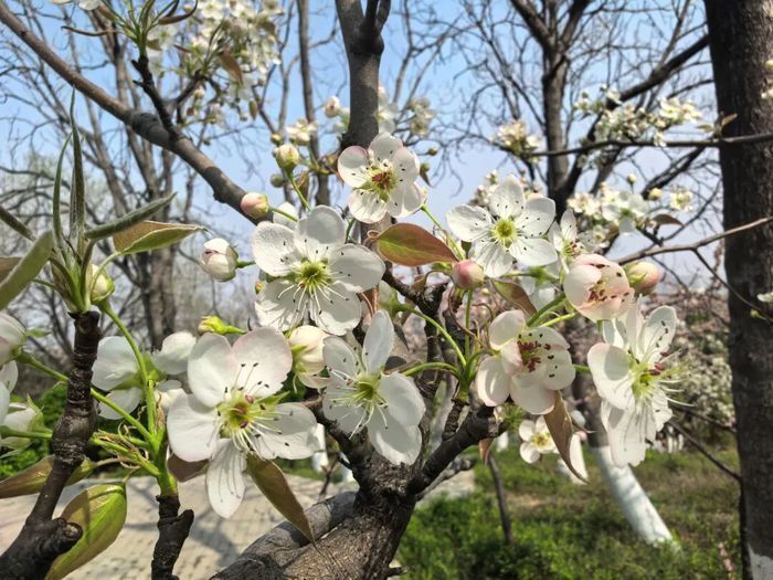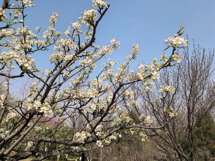 位于文昌阁东侧、弥勒胜苑西侧的梨园,占地约2600平方米,50余株梨树正值盛花期。梨花素雅清丽,花瓣轻薄如云,满树雪白,宛如覆雪凝霜。细看花药,竟是点点红紫,别有风致。花期仅十日左右,简约雅致间,是春日里难得的静谧打卡地。